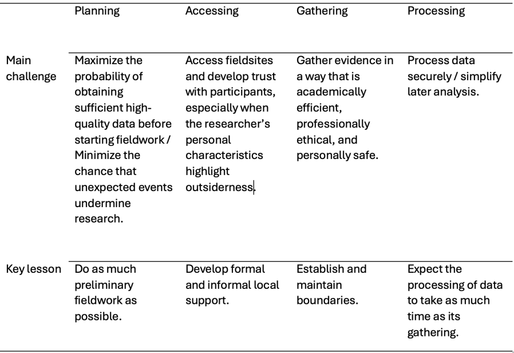 We organize our ideas by dividing the fieldwork experience into four stages: planning, accessing, collecting and processing (see table below). At each point we identify the main challenge, and a key practical lesson. This way, we highlight that projects begin much earlier than research trips and conclude long after the researcher has returned from the field.