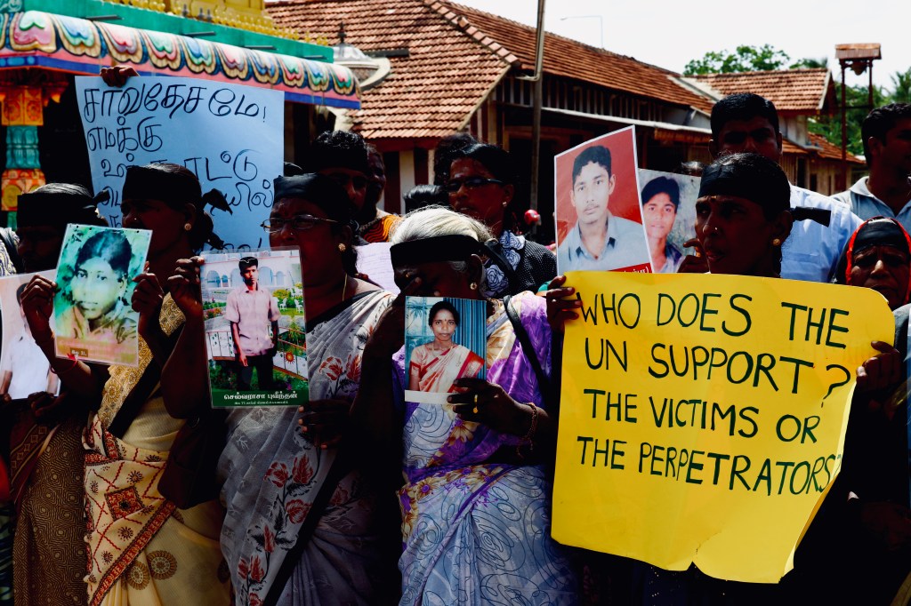The postwar years have been defined by civilian resistance centred on demands for truth and justice, and citizenship grievances bound to militarization and landgrabs. Notable among these were the protests of the Tamil families of the disappeared. Enforced disappearances have served as a heavy-handed instrument of state terror since the early 1970s. The war years saw a surge in arbitrary arrests and abductions of ‘suspects’ and ‘subversives’ resulting in the disappearance of thousands of Tamils including those who surrendered to the military at the end of the war in 2009. Beginning in February 2017, their families have engaged in over 1400 days of continuous protest to-date, asking to know the whereabouts of their loved ones. Where their demand for answers have been dismissed by the state or performatively recorded by way of hollow bureaucratic processes of census and testimony, sustained marches appealed to and called out the failures of international mechanisms for accountability. Hand-drawn cardboard signs in both Tamil and English and printed flex banners wielded by demonstrators are interspersed most powerfully with portraits of the disappeared. Copies of identity documents held up in protest asserted the state’s own proofs of life to evidence its crimes. The protesters persevered as a determined, embodied, mobile memorial to the abruptly shortened lives of their loved ones.
