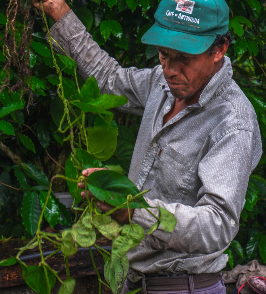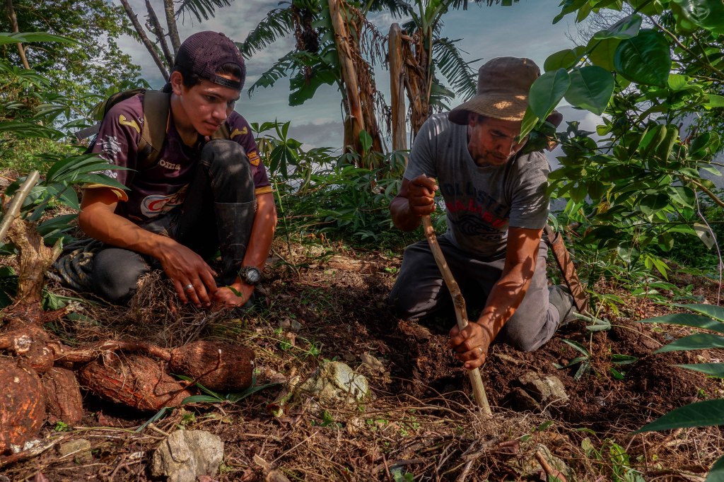 Este primer conjunto de fotos explora las prácticas de agricultura de subsistencia. Aunque las y los campesinos de Briceño estaban acostumbrados por mucho tiempo a cultivar casi todo lo que comían, las ganancias de la coca les dieron la posibilidad de comprar otros alimentos y desvió su energía de los cultivos de subsistencia. Con la desaparición de la economía cocalera, muchas y muchos campesinos han vuelto a la agricultura de subsistencia por necesidad, cultivando alimentos tradicionales como fríjoles, plátanos, yuca, maíz y una variedad de vegetales. Aunque estos cultivos aseguran el sustento de sus familias, a las y los campesinos se les dificulta mucho venderlos. No solo porque las y los vecinos ya no compran alimentos con dinero de la coca, sino también por los cambios en los regímenes de política económica, que empezaron con la apertura económica en 1990 y culminaron con el tratado de libre comercio con los Estados Unidos de 2012, que han producido una caída significativa de precios. Muchas y muchos campesinos se han dado cuenta con disgusto que los precios de mercado, impuestos por alimentos importados como los fríjoles y el maíz, están por debajo de su costo de producción.